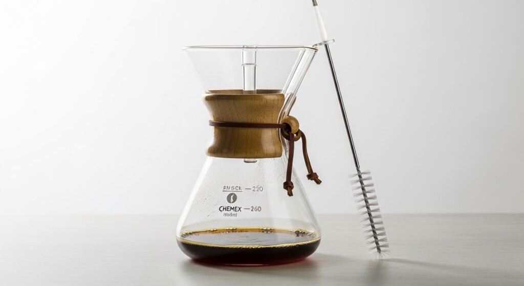 Always use filtered water to prevent “scale” from clouding the glass. To clean it, use a long-handled brush and a specialized coffee detergent that breaks down proteins and oils. If you notice a brownish tint at the bottom of your Chemex, your sensory experience is being compromised. A clean Chemex should be as transparent as the water you pour into it.