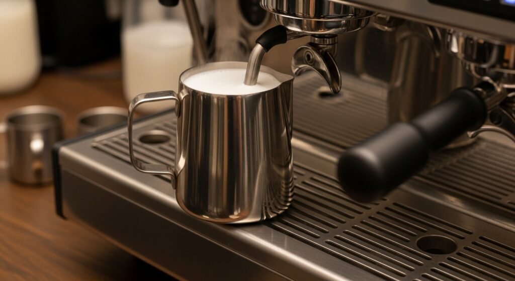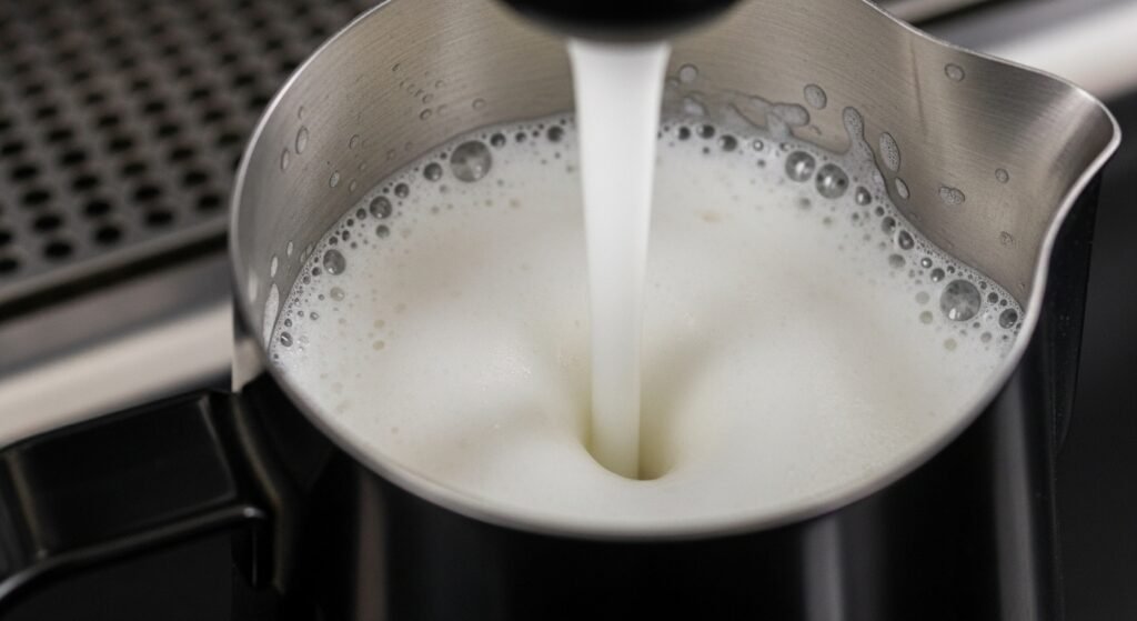 The vortex is a mechanical filter. It takes the large bubbles you created during the stretching phase and pulls them down into the blades of the steam, “chopping” them into micro-bubbles. This ensures that the foam is integrated throughout the entire pitcher, rather than just sitting on top. This integrated texture is what allows you to pour latte art—without it, you’ll just get a “blob” of foam followed by watery milk. This level of precision is just as important as maintaining your equipment to ensure the steam pressure is consistent.
