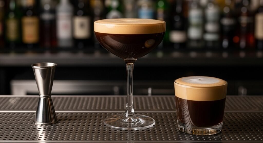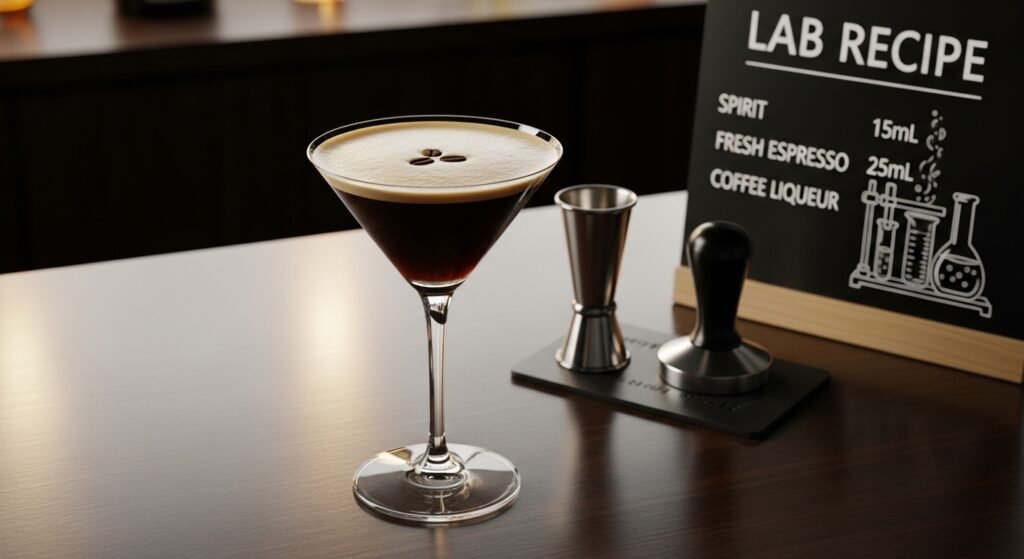 Regardless of the spirit, the golden ratio of the cocktail must be respected. A standard “Lab Recipe” is 50ml Spirit, 25ml Fresh Espresso, and 15ml Coffee Liqueur (adjusting sugar syrup based on the roast profile of the coffee).