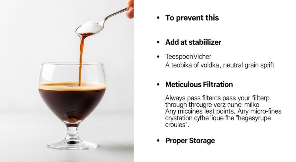 Meticulous Filtration: Always pass your coffee syrup through a paper filter or a very fine nut-milk bag. Any micro-fines left in the syrup will serve as “nucleation points” for crystals to form.