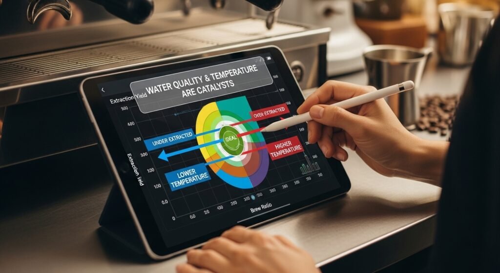 To move within this chart, the barista must understand that water quality and temperature also act as catalysts. Higher temperatures increase the rate of extraction, effectively moving you to the right on the chart without changing the ratio.
